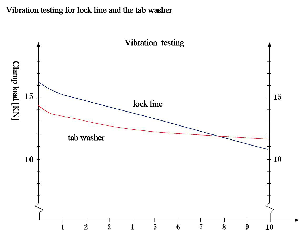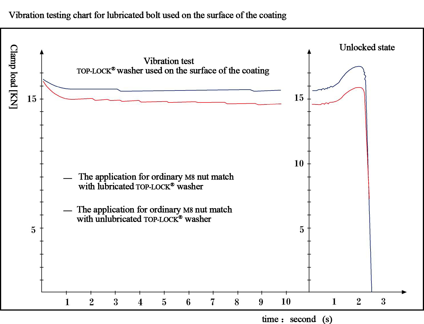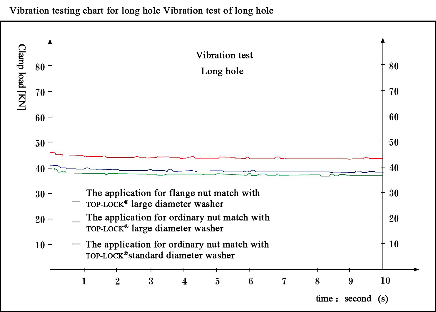 ◆ Fittings vibration test is one of the reliability of the bolt connection methods The vibration test of TOP-LOCK® secure fastening system conforms to the DIN 65151 standard and DIN25201 standard. Pre-tightening force(bolt tensile) is measured by the radial force transducer. ◆The locking effect with TOP-LOCK® standard nuts is greater than with ordinary ones (such as nut of nylon material).Bolt by the friction between the screw thread lock, thus lost most of the pre-tightening force produced by vibration, this is mainly caused by the sink in the thread.And those from the TOP - LOCK®fixed parts only show a small part lost pre-tightening force. ◆When using TOP-LOCK® washer ,after appropriate tighten nut, bolt is firmly locked.Solid locking performance is that pre-tightening force increased when using wrench to loosen the nut (rather than loose nut in an instant).This is the unique feature of the TOP-LOCK® washer . ◆This test shows : TOP - LOCK ® securing and fastening system can safely fastening screw/bolt connection: basic constant clamping force after 2000 turn. At the beginning of the test , a small amount of tension loose only due to the normal bolt connection.