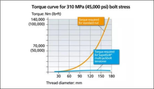 一般來說,要想緊固好直徑大于1英寸的螺栓需要使用力矩放大器。傳統的緊固方法包括錘擊、加熱、液壓扳手、液壓拉伸器等。這些方法不但存在精度差、耗費時間、設備昂貴、安全隱患,而且經常出現螺紋咬死(金屬粘連)現象。